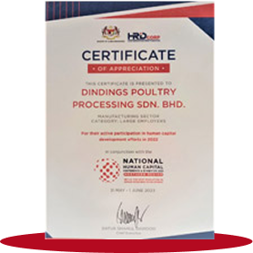 Certificate of Appreciation from HRDC for Dindings Poultry Processing Sdn. Bhd.
